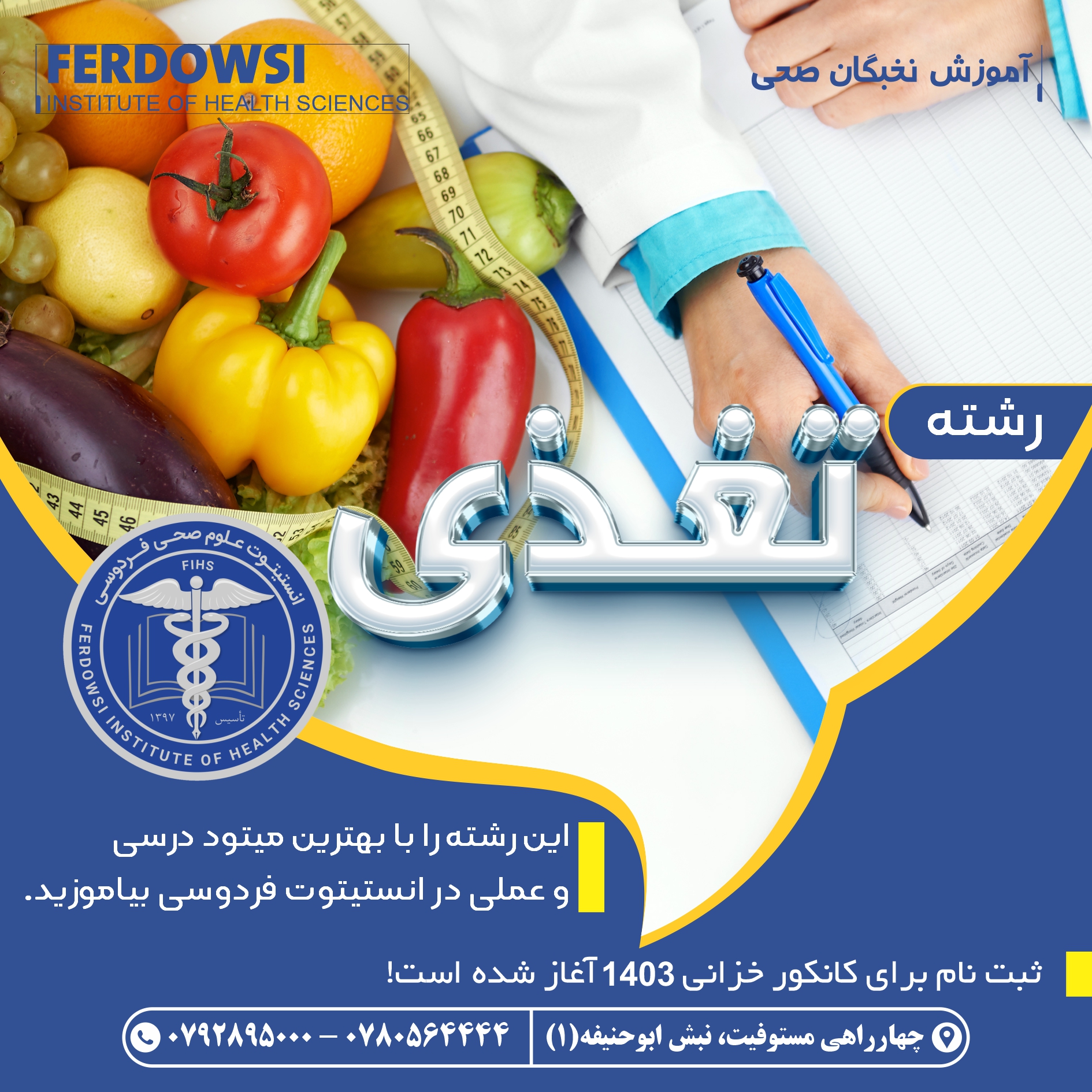 رشته تغذی با میتود استندرد درسی و عملی و استادان مجرب و ورزیده در انستیتوت علوم صحی فردوسی در سال 1403 شروع به فعالیت نموده است و در این رشته ثبت نام آغاز شده است.