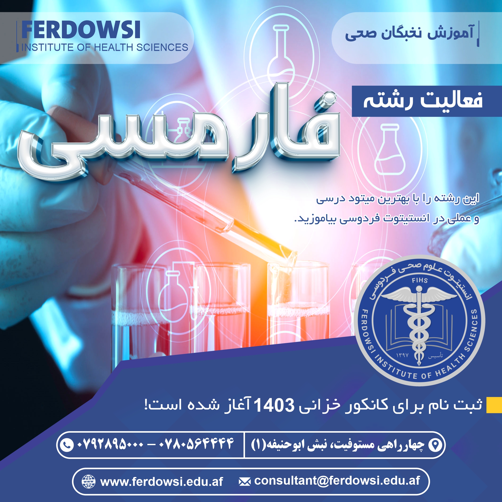 رشته فارمسی را با میتود استندرد درسی و عملی در انستیتوت علوم صحی فردوسی در سال 1403 شروع به فعالیت نموده است و در این رشته ثبت نام آغاز شده است.
